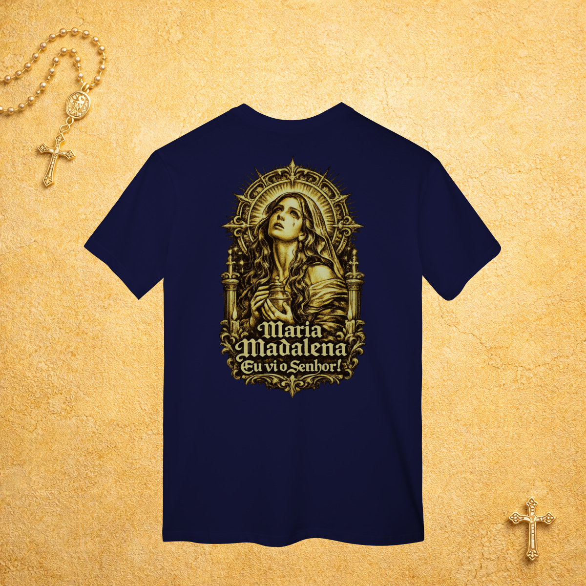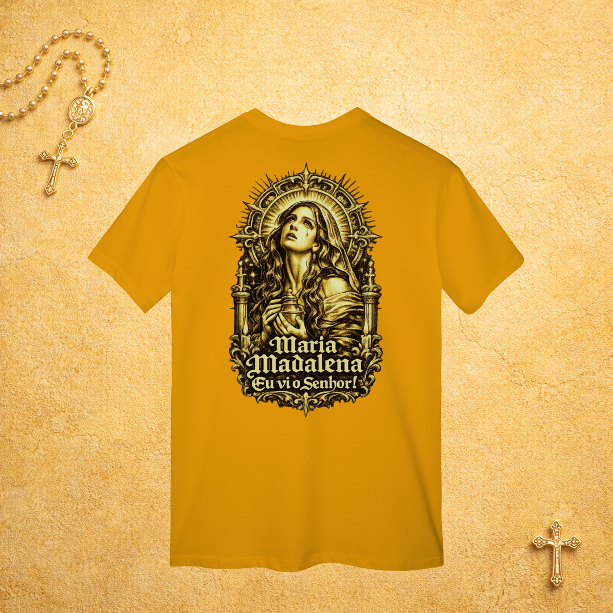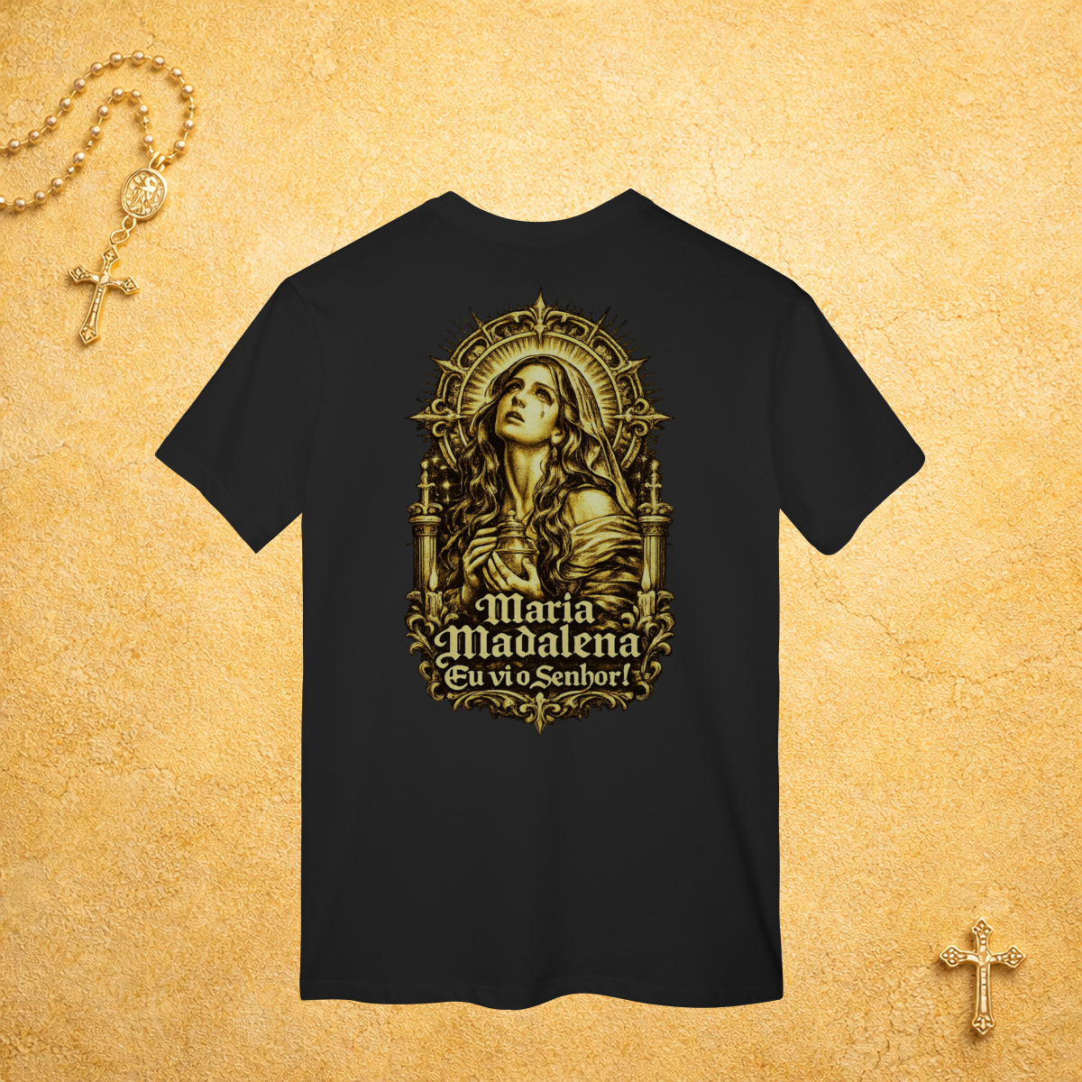 A parte da frente da camiseta é básica, sem estampa. Mas nas costas, a estampa grande e dourada mostra o tamanho da sua fé!