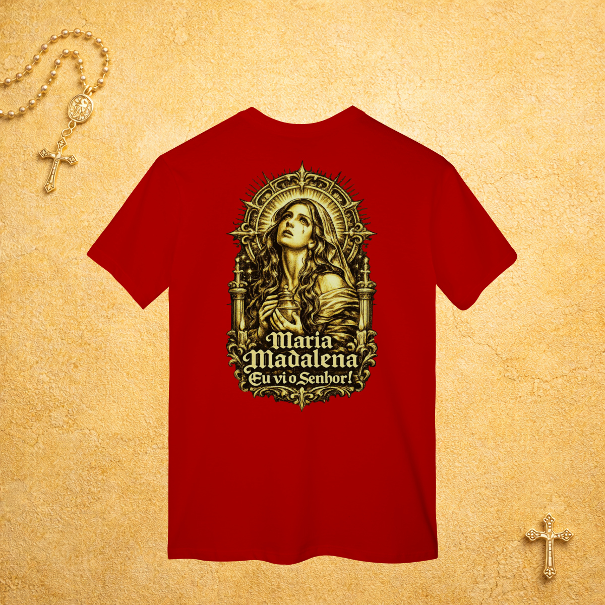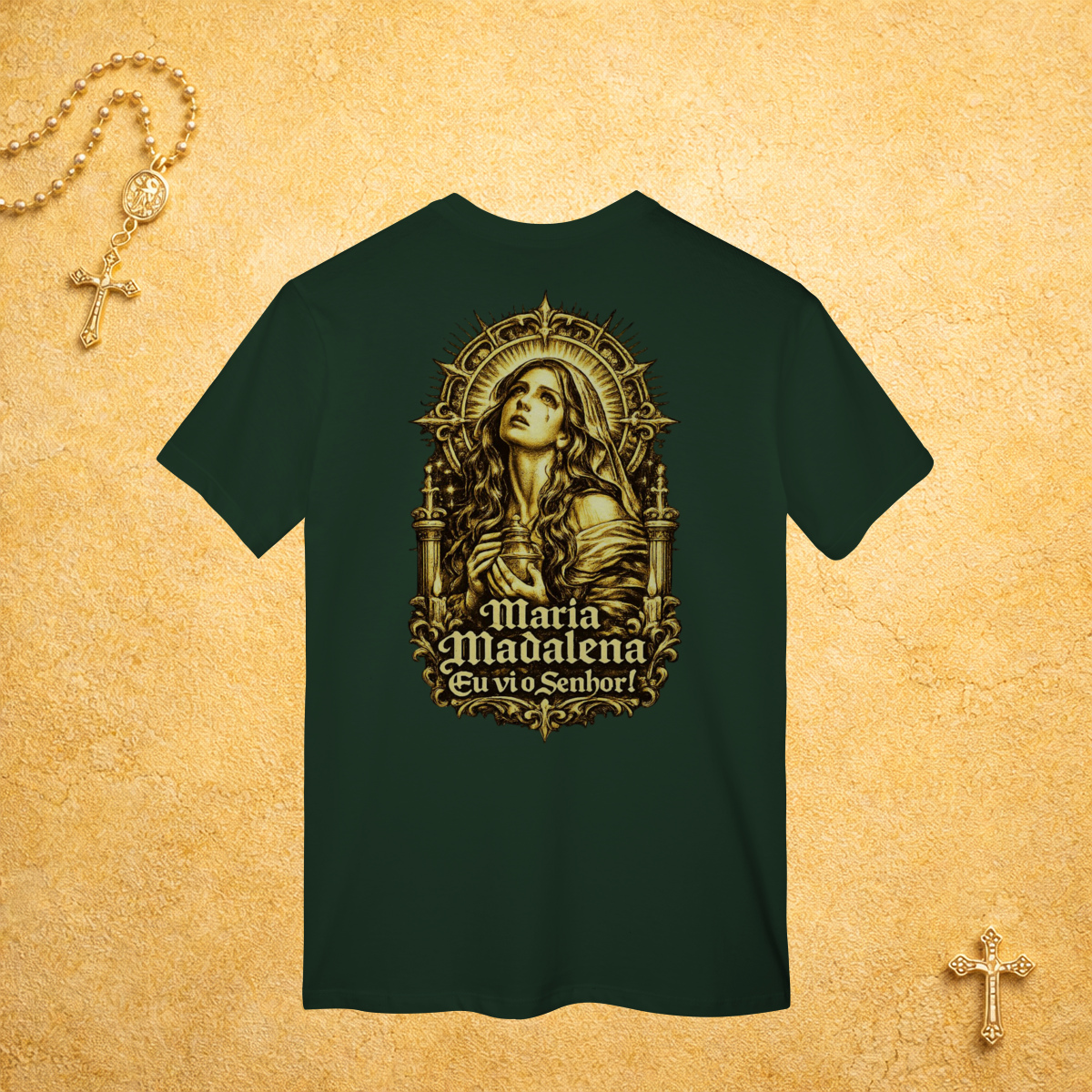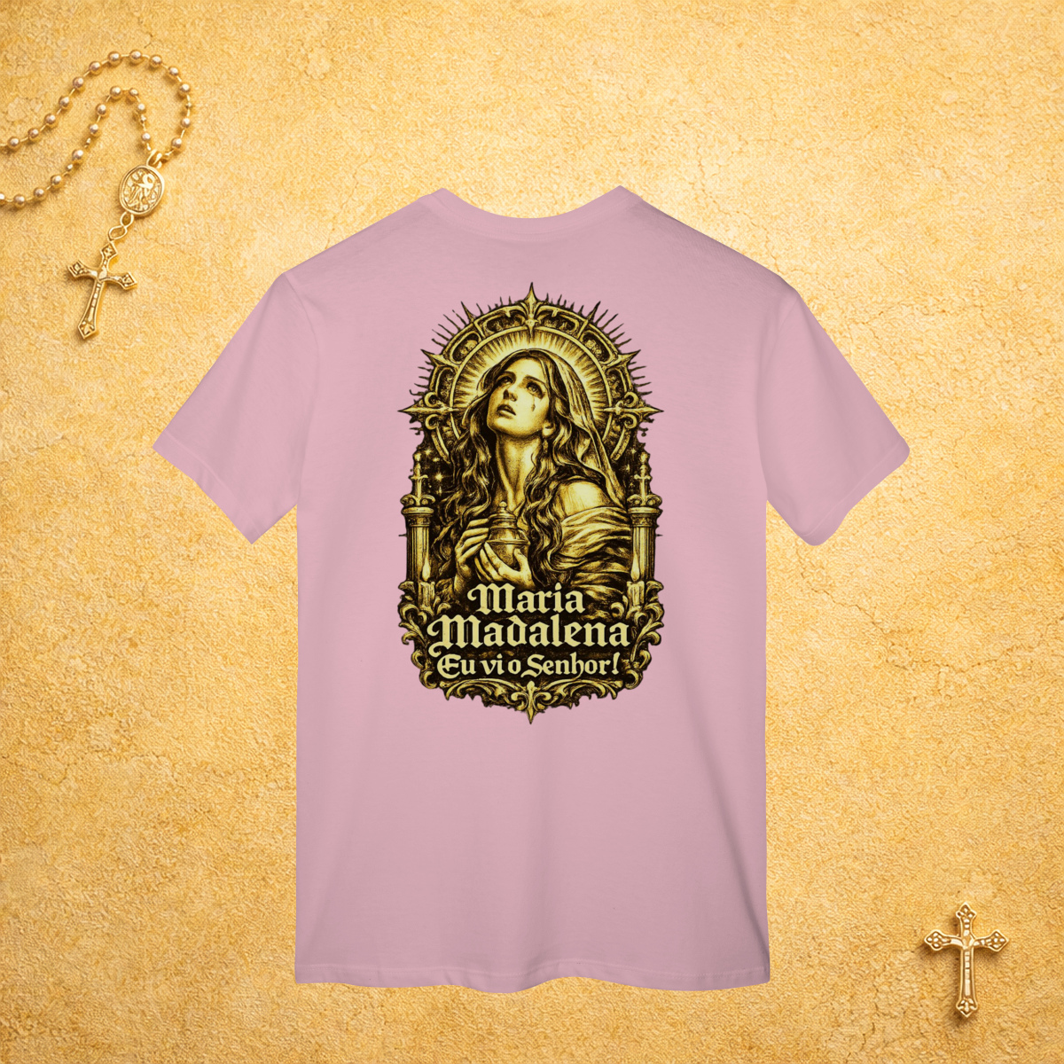 A parte da frente da camiseta é básica, sem estampa. Mas nas costas, a estampa grande e dourada mostra o tamanho da sua fé!