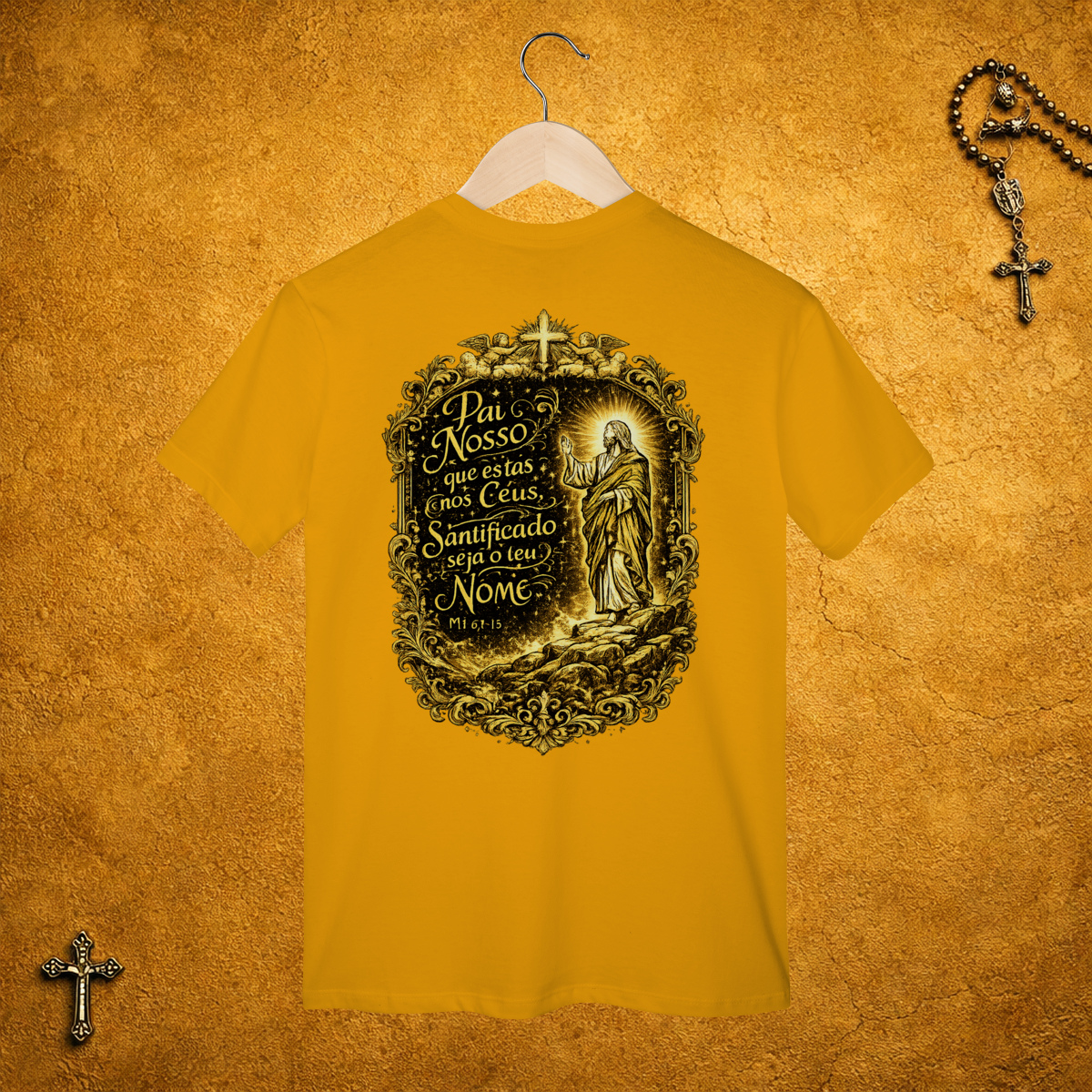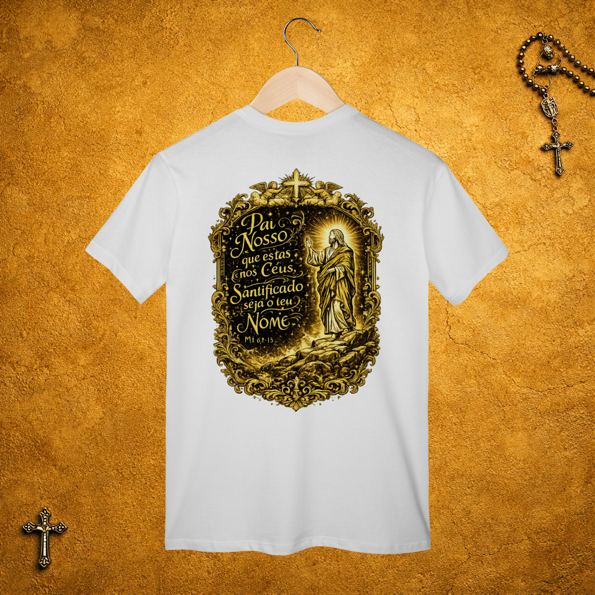 A parte da frente da camiseta é básica, sem estampa. Mas nas costas, a estampa grande e dourada mostra o tamanho da sua fé!